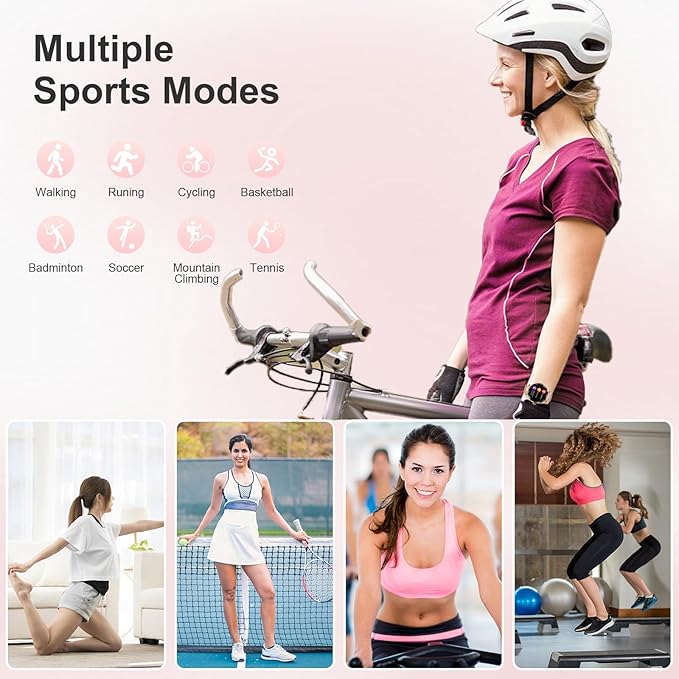 - 🚴♀ Smartwatch with Multiple Sport Modes: The women's fitness tracker supports multiple sports modes (walking, running, hiking, cycling, basketball, etc.) automatically monitors and records daily steps, exercise time and calorie consumption in real time, and synchronizes them to the App. Help you establish good exercise habits and a more positive lifestyle.