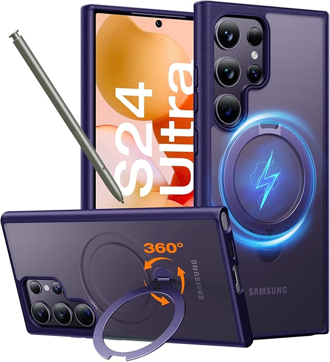 - 【3-in-1 Versatile Kickstand】Not only a stand, but the ring also integrates charging and ring holder, all at once. Whether you prefer a vertical setup for video calls or a horizontal orientation for TV shows, this purple S24 ultra case with kickstand has got you covered. It doubles as a handy ring holder for you to hook when your hands are full, allowing effortless one-finger handling. The highly conductive zinc alloy kickstand enables fast charging without the need for removal