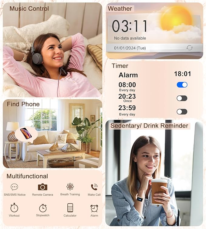 - 【Make/Answer Calls & Read Message】Smart watches for women have built-in microphone and speaker, after connecting with your phone via Bluetooth, you can make/answer calls directly from your smartwatch by synchronizing your contact list or dialing manually. Your messages can be synchronized and displayed on the smartwatch, such as SMS, Facebook, X, WhatsApp, etc. You can easily get real-time notifications without taking out your phone, and you no longer need to worry about missing important calls and messages. Watch also features AI voice assistant function for your convenience