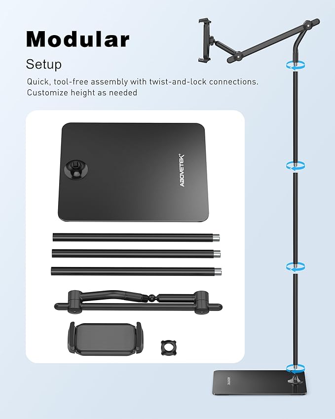 - Effortless Tool-Free Assembly: Set up your new tablet floor stand in minutes! The simple twist-and-lock arm connections require no tools. Get instant, hassle-free stability and convenience for your iPad or tablet reading and viewing anywhere in your home or office.