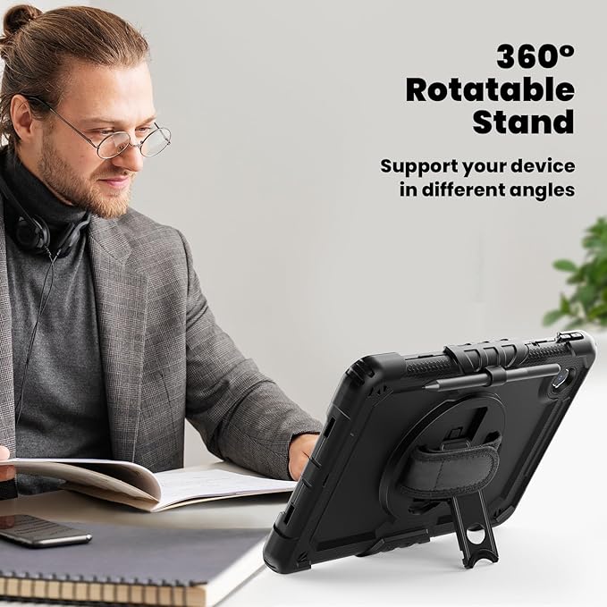 - Built-in Kickstand is 360 degree rotatable kickstand offers optimum position for typing or viewing; Ergonomic and comfortable back handle allows you to grip your tablet securely and steadily with one hand, worry-free from dropping it