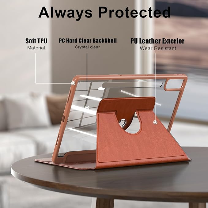Case for Lenovo Tab P12 12.7 Inch 2023 Tablet,360° Rotating Transparent Back Shell Protective Case with Auto Wake/Sleep Function,Brown