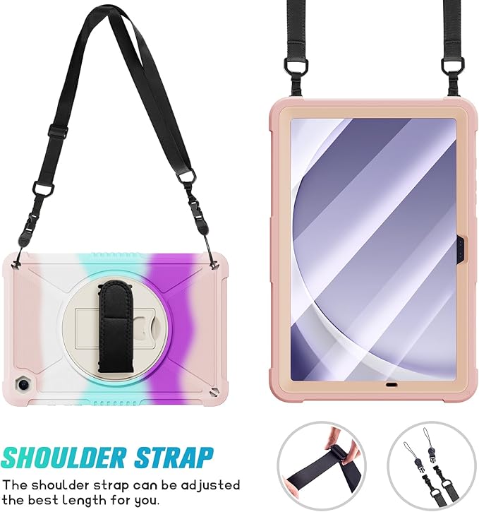 - đăPortable Shoulder StrapăThe adjustable shoulder strap provides the secureest protection and more convenience when you play or work with Samsung Tab A9+. Hang it anywhere for your better entertainment, make your hands free.