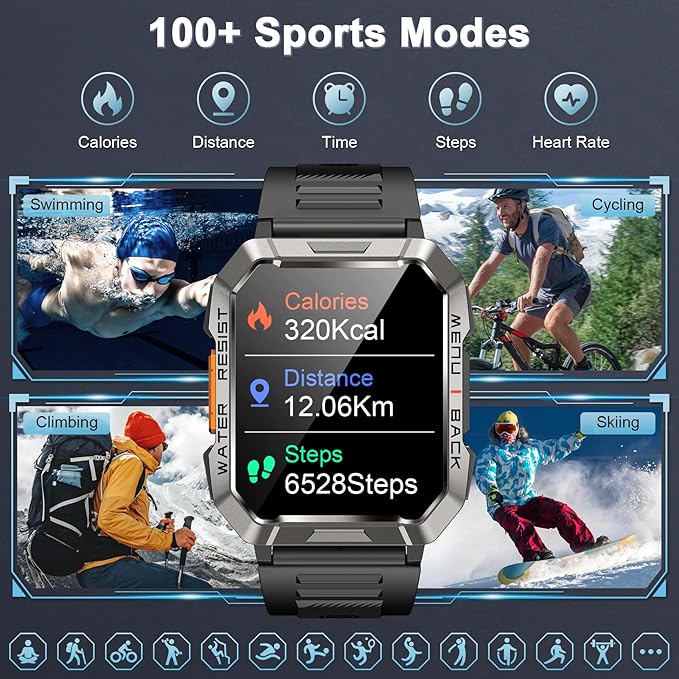 - đăMilitary Standard Quality & 100 Day+ Ultra-Long Life Batteryă- The frame of the military smart watch for men is made from a special aluminum alloy material,successfully passed 12 military tests, is rugged, waterproof, dustproof, and can handle all the extreme environments.with a battery capacity of up to 900mAh, 5 times of traditional smartwatches. Offers 100 days standby time and 30 days for daily usage, say goodbey to frequent charge, no more need to bring so much cables for long trip!