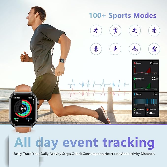 YMS Android Smart Watch for Women - Bluetooth Call,Compatible with Android & iOS,2.0" HD Screen, Heart Rate/Sleep/Step Tracker, 100+ Sports Modes,IP68 Waterproof Men Fitness Tracker (Brown(Leather))