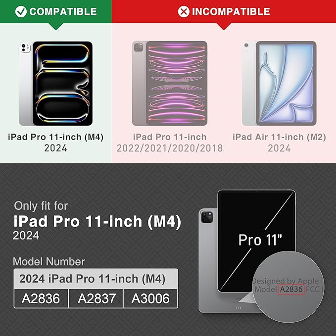 - Perfect Match: Designed for iPad Pro 11 inch 2024 (Models: A2836, A2837, A3006); Allows easy access to all buttons, controls and ports without removing the case; Notice: Please identify your iPad model before purchasing