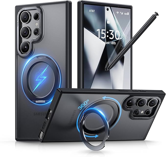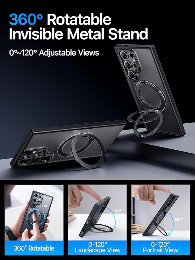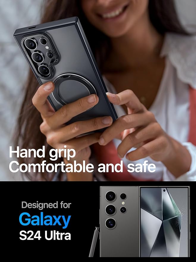 - 【QStand Series Kickstand Case】Introducing the QTlier 360° Spin Magnetic Stand for Samsung Galaxy S24 Ultra! Say goodbye to your phone handling worries. Our innovative case features a 360° rotating metal ring for a secure grip, enhancing your user experience. The flexible stand adjusts to any angle, perfect for all your needs. Whether you're video chatting or scrolling through TikTok in portrait mode, or watching movies in landscape mode, the stand effortlessly folds back into the groove when not in use. Upgrade your phone experience today with the QTlier 360° Magnetic Kickstand Case!