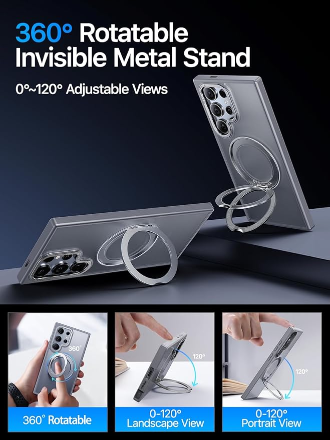 - 【QStand Series Kickstand Case】Introducing the QTlier 360° Spin Magnetic Stand for Samsung Galaxy S24 Ultra! Say goodbye to your phone handling worries. Our innovative case features a 360° rotating metal ring for a secure grip, enhancing your user experience. The flexible stand adjusts to any angle, perfect for all your needs. Whether you're video chatting or scrolling through TikTok in portrait mode, or watching movies in landscape mode, the stand effortlessly folds back into the groove when not in use. Upgrade your phone experience today with the QTlier 360° Magnetic Kickstand Case!