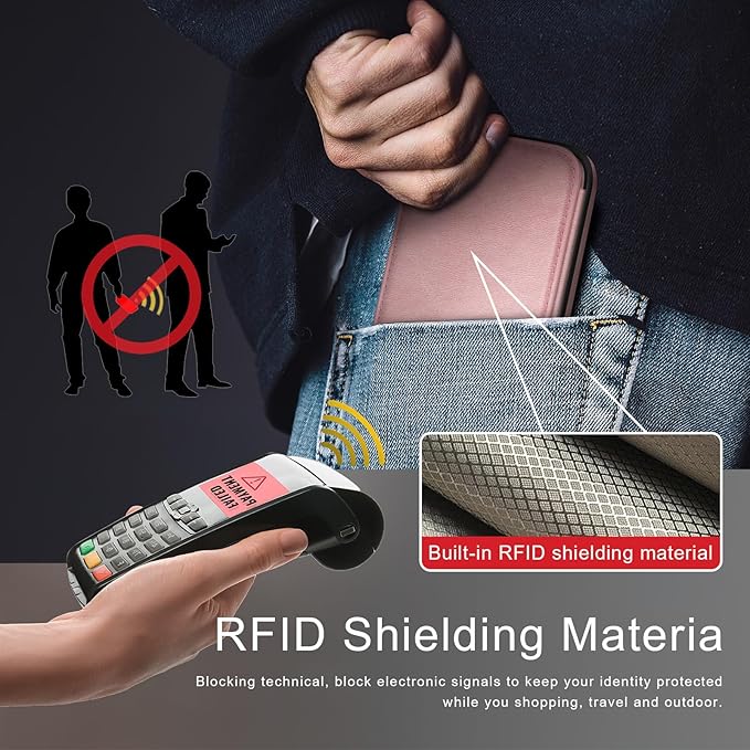 - [Credit Card Anti-Theft Swipe Function]---This RFID Blocking leather wallet case is designed to protect your card information.The RFID Shielding Technology to block unauthorized access.Many cards,including credit,debit and ID cards,contain an RFID chip.(This chip can be read by an RFID reader from up to 10 feet(about 3 meters) away, without any physical contact.)