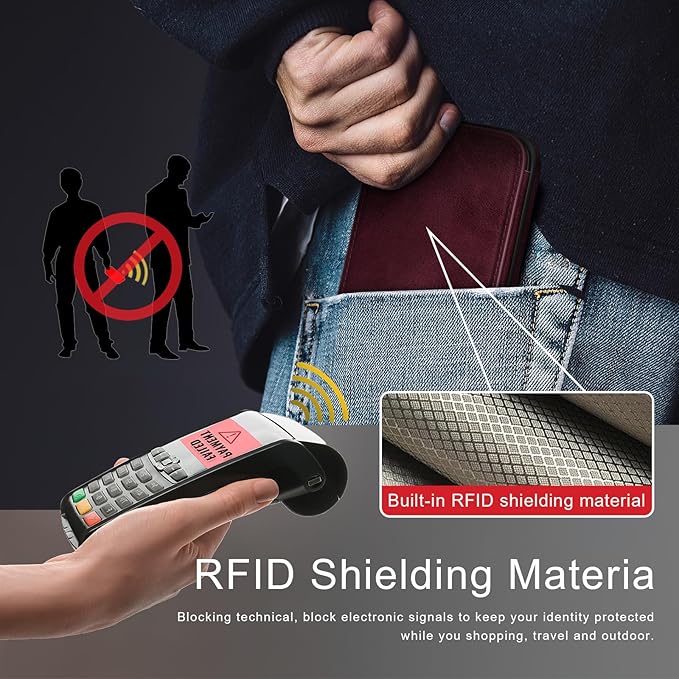 - [Credit Card Anti-Theft Swipe Function]---This RFID Blocking leather wallet case is designed to protect your card information.The RFID Shielding Technology to block unauthorized access.Many cards,including credit,debit and ID cards,contain an RFID chip.(This chip can be read by an RFID reader from up to 10 feet(about 3 meters) away, without any physical contact.)
