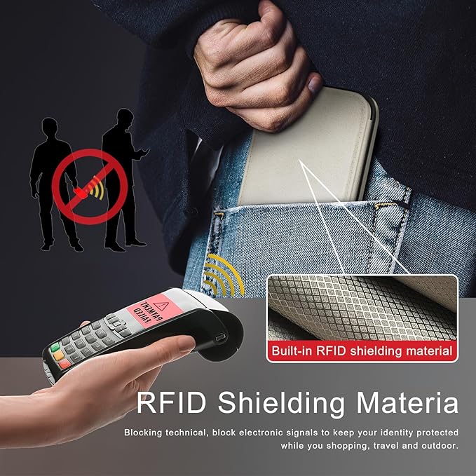 - [Credit Card Anti-Theft Swipe Function]---This RFID Blocking leather wallet case is designed to protect your card information.The RFID Shielding Technology to block unauthorized access.Many cards,including credit,debit and ID cards,contain an RFID chip.(This chip can be read by an RFID reader from up to 10 feet(about 3 meters) away, without any physical contact.)
