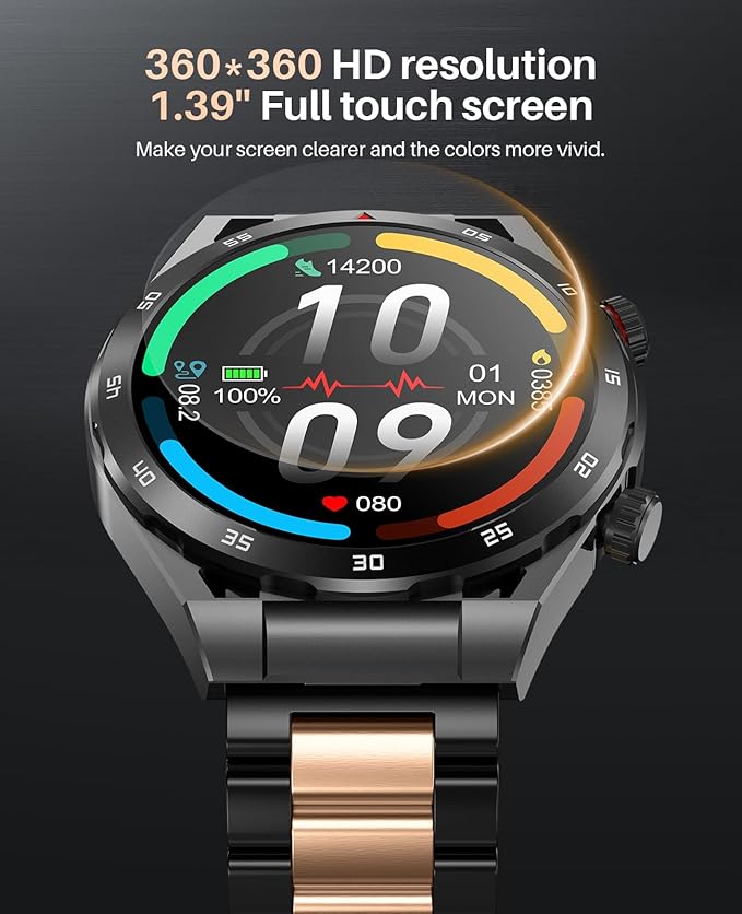 - 1.36-INCH HD ROUND SCREEN — This men's smartwatch features a 1.39-inch HD full-touch display with a high resolution of 360x360, delivering delicate and realistic visual effects. Whether you are checking messages, monitoring health data, or browsing various functions, you'll enjoy a clear and smooth operation experience. It feels like being in a miniature HD world, making every use a pleasure.