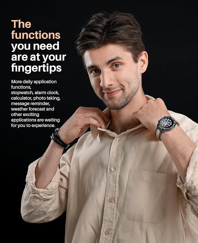 - MULTIPLE PRACTICAL FUNCTIONS — This smartwatch not only includes common features like music control, weather forecasts, and breathing exercises but also offers a stopwatch, flashlight, calculator, and timer for everyday convenience. Additionally, it has a thoughtful sedentary reminder to help you maintain a healthy lifestyle. Whether you're engaged in sports and fitness, daily work, or leisure activities, this smartwatch provides comprehensive smart assistance, making your life more convenient and efficient.