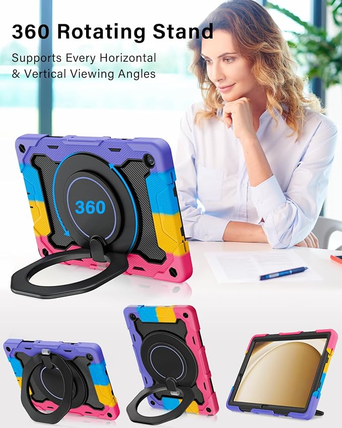 - [Multiple angles of kickstand/Magic Kickstand & Handle] Upgrade 360 rotating and foldable kickstand provides angle between 20-75 degrees of horizontal (landscape) or vertical (portrait) orientation for your 11 inch Galaxy Tab A9+ tablet. Also offers hand hold and hung on wall using by handle function, allow you use or carry much easier, match up all kinds of group
