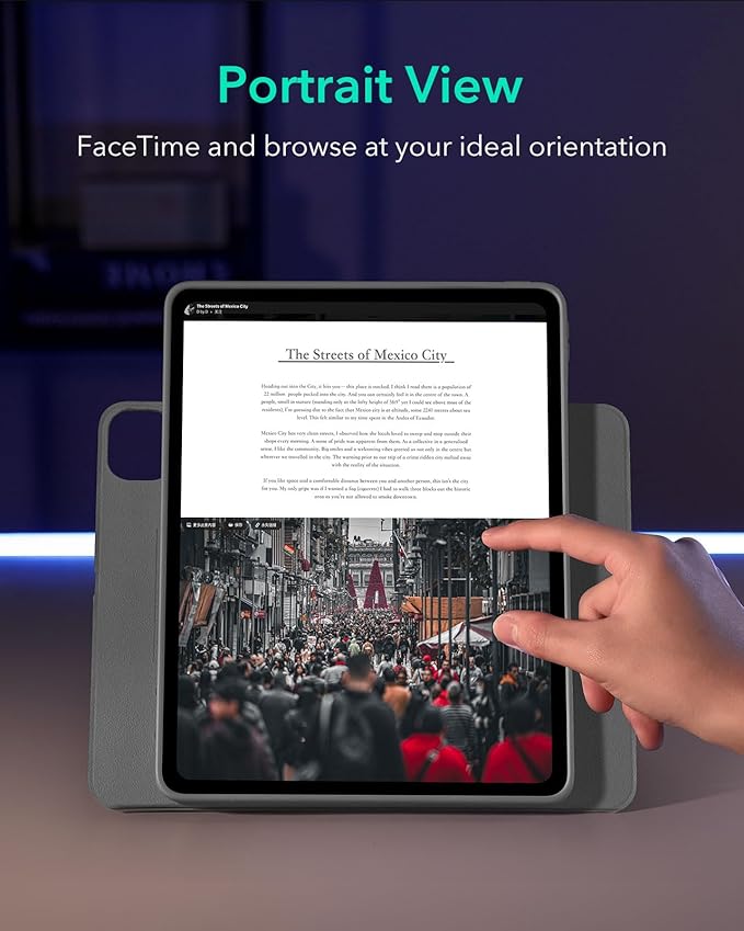- Raised Screen View: enjoy a raised view of your iPad Pro closer to your natural eye line and sit upright in a more comfortable position during long periods of use