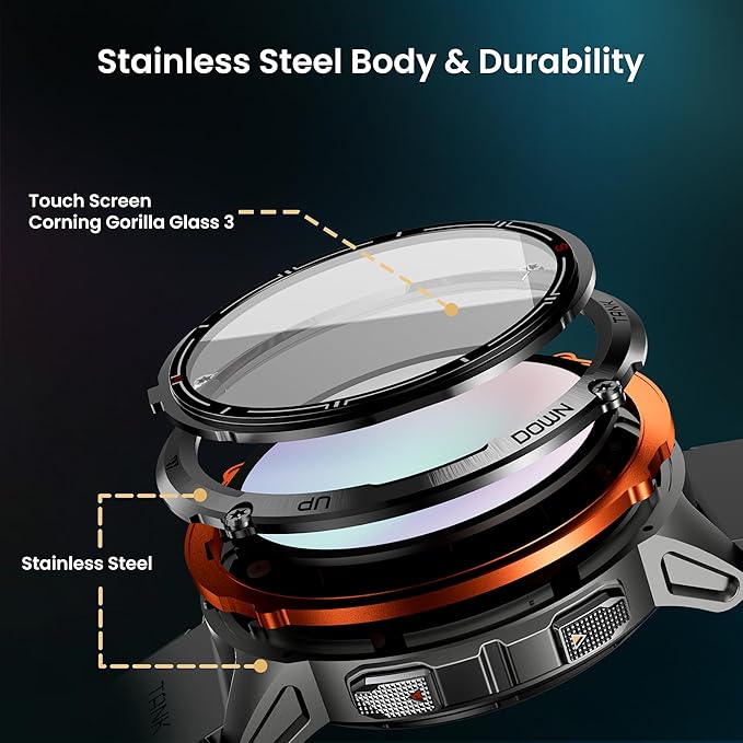- ➤【Full Stainless Steel Unibody & Gorilla Glass】KOSPET T3 Ultra 2 Men's Smartwatch with a unibody stainless steel case, boasts a 1.43" 3rd generation Corning Gorilla 9H double-layer glass display. The overall sports charm and casual business aesthetics make it highly resistant to scratches, drops, and polishing. It remains unfazed by any kind of wear and tear, falls, or collisions in daily life.