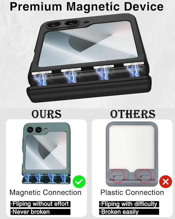 - [Advanced Hinge Protection]: Our Z Flip 6 Case, 7 FE case features an innovative hinge protection design specifically for the Galaxy Flip 6 Case, Flip 7 FE Case, providing complete protection from all angles. Our Z Flip 6 Case, Flip 7 FE case is designed with a unique magnetic connection that won't be broken by impacts such as drops. Besides, our Z Flip 6 Case, Z Flip 7 FE Case with unique design flips more smoothly without spring resistance.
