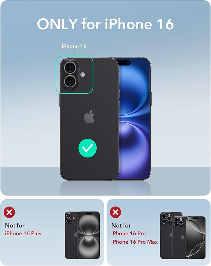 - Compatibility: only for iPhone 16; camera lens protectors not included