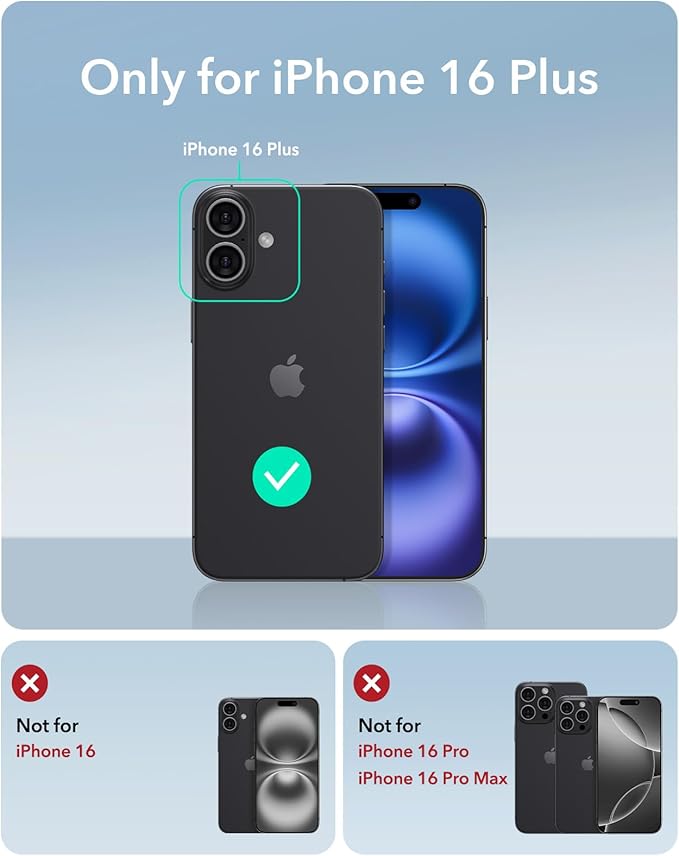 - Compatibility: only for iPhone 16 Plus; camera lens protectors not included