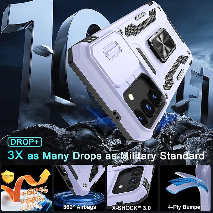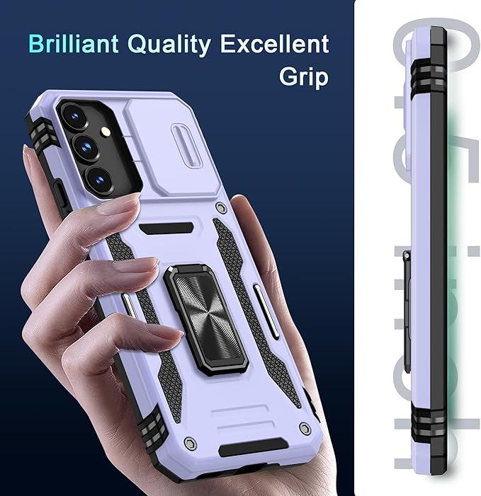 DEERLAMN Case for Samsung Galaxy S24 FE 6.7-Inch with Slide Camera Cover+Screen Protector(1 Pack), Rotated Ring Kickstand Military Grade Shockproof Protective Cover-Light Purple