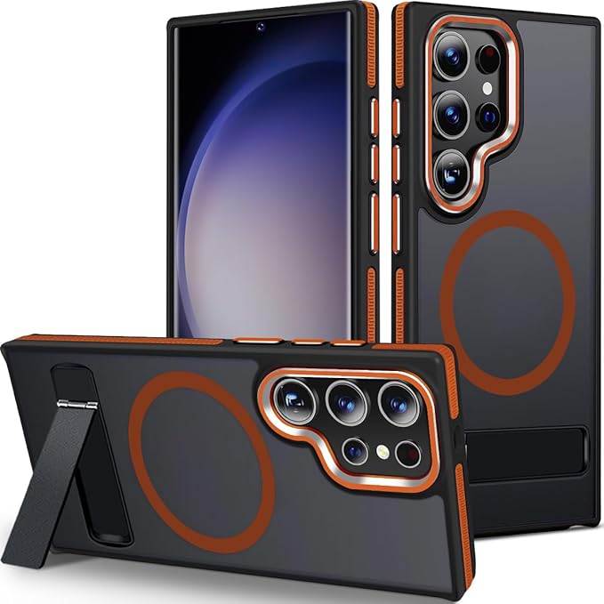 Case for Samsung Galaxy S24 Ultra with Kickstand, Compatible with MagSafe, Anti-Slip Galaxy S24 Ultra Case, 3-Modes Stand Military-Grade Protection, S24 Ultra Magnetic Cover (Black/Orange)