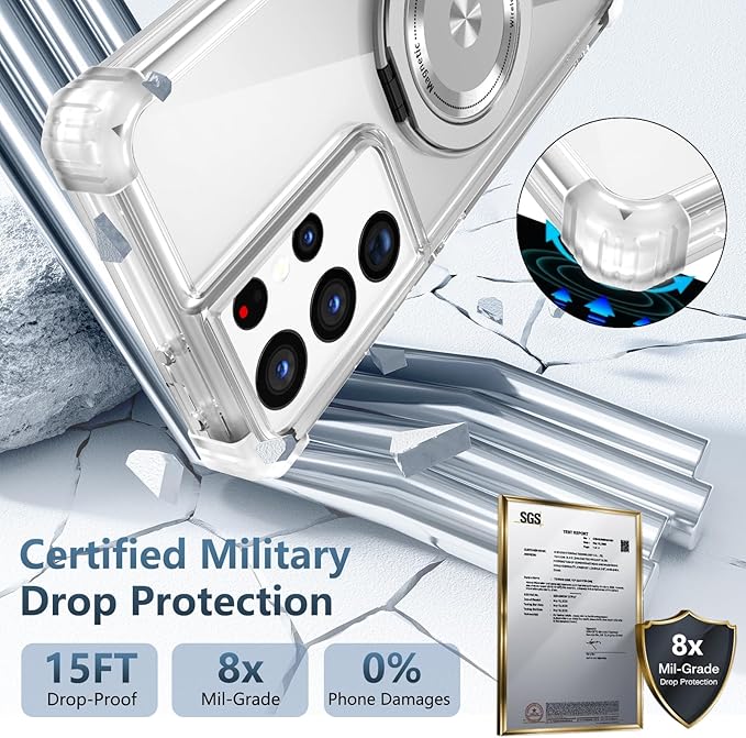 for Samsung Galaxy S21 Ultra Case Compatible Wireless Charging Magnetic,with Screen Protector,for S21Ultra Phone Case with 360°Stand Ring Military Grade Shockproof Heavy Duty Protection Clear
