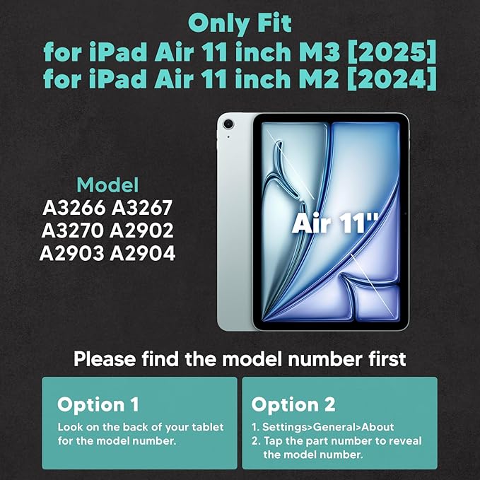 - Compatibility: Only fit for iPad Air 11 Inch 2025 M3 / 2024 M2, for iPad Air 7th/ 6th Generation (A3266/ A3267/ A3270/ A2902/ A2903/ A2904); please double check the model number on the back of tablet (A****) before purchase.