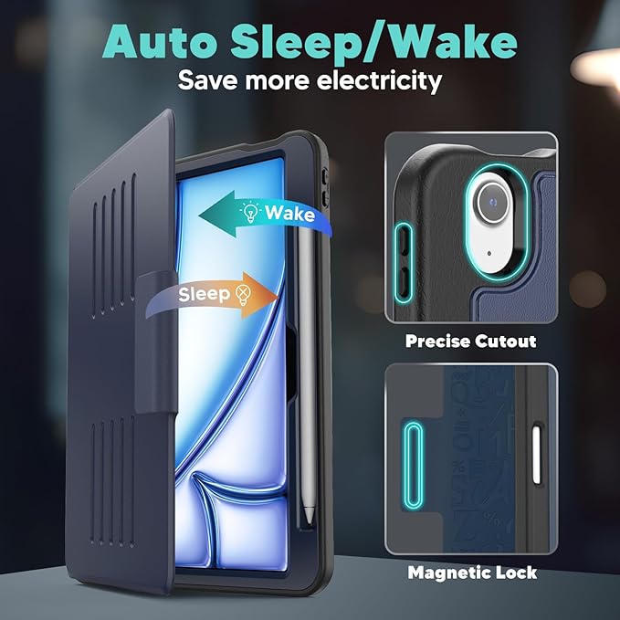 - Strong Magnetic and Auto Sleep/Wake: With strong magnetic adsorption function, case for iPad Air 6th Generation 11 inch can be adsorbed on fridges; the leather cover also comes with a magnetic lock, which can fasten the front and rear covers.