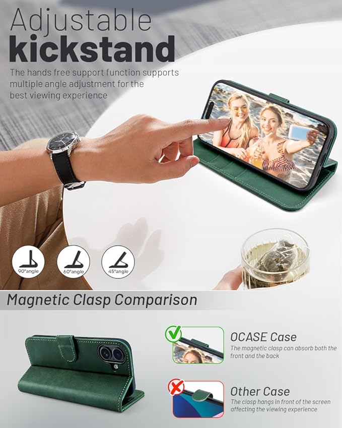 OCASE Compatible with iPhone 16 Wallet Case, PU Leather Flip Folio Case with Card Holders RFID Blocking Kickstand [Shockproof TPU Inner Shell] Phone Cover 6.1 Inch 2024, Blackish Green