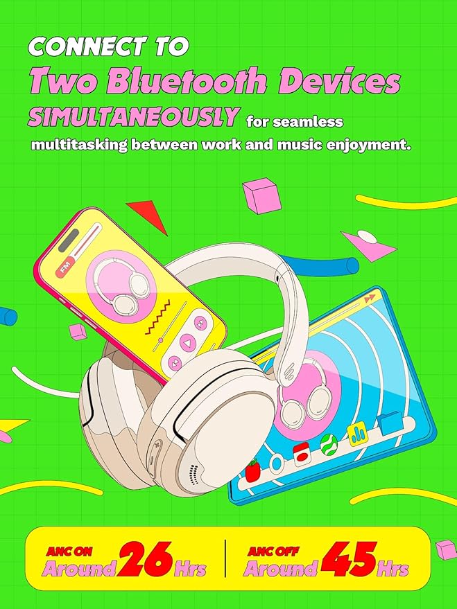- [Long Battery Life] With a built-in large-capacity battery and a low-powerconsumption chipset, it offers up to 45 hours of continuous music playback with ANC off, a 10-minute charge provides 8 hours of use, ensuring prolonged convenience.