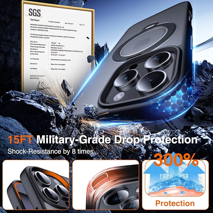 - 🛡️[How’s the Protection? Military-Grade Tested Drop Protection]: This iPhone 15 Pro Max Case with stand ring holder got military-grade toughness that can handle even the toughest drops. Its hidden air cushions embedded in the four corners absorb and disperse shockwaves upon impact, keeping your phone safe from crack. It also safeguards your camera and screen with a raised lip of 1.5mm, guarding these delicate from scratches. And all this, without adding undue bulk or weight.