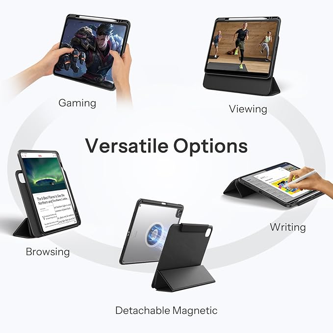 - Adjustable Stand: Customize your iPad experience with 5 unique use modes. The detachable magnetic case provides hands-free viewing, reading, or typing experiences, and the clear back case can be easily to detach for ergonomic comfort during cooking or gaming