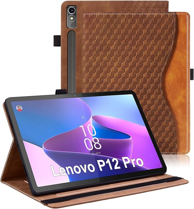 - [Multifunctional]: The lenovo P12 Pro 12.7" case features a pen slot, card pocket, and stand. The pen slot securely holds an Apple pencil. It has a large front pocket with two interior card slots for carrying your ID, credit cards and tickets. Multi-angle design makes it easier to watch movies and read materials. Elastic band prevents the tablet case from accidentally opening and protects the screen and built-in cards from falling out