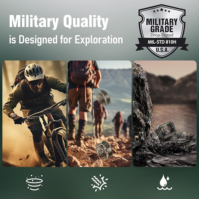 - 【100+ Sport Modes Fitness Tracker】The Military Smart watch supports 100+ sport modes, such as walking, running, hiking, basketball, cycling and more. The reference data of the exercise will be uploaded to the APP, set a goal for your exercise, and work hard to achieve it. In addition, it can also be used as an assistant: music and photo camera control, weather display, long sitting reminder, water reminder, alarm clock, stopwatch, mobile phone search,etc.
