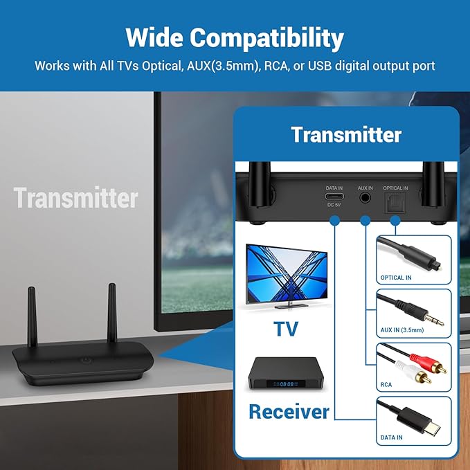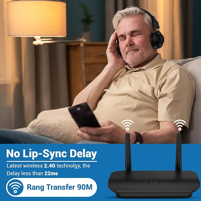 - Wide Compatibility: Turn on the transmitter and our wireless headphones for TV, they will be automatically connected. Support most TVs with Optical, AUX(3.5mm), RCA, or USB digital output port. While our wireless headphones for TV watching also can be worked as a separately Bluetooth 5.0 headset,which directly connect it with your mobile phone, laptop, AV receiver and so on via Bluetooth.