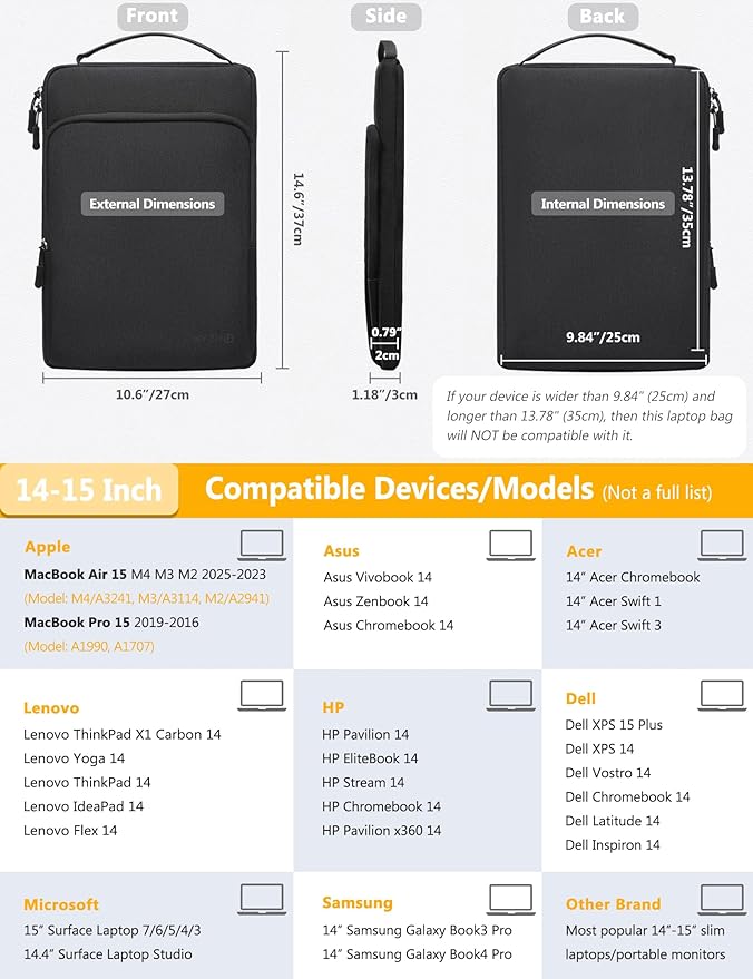 - Internal Dimensions: 13.78" x 9.84" x 0.79". Compatible with MacBook Air 15 M4 M3 M2 2025-2023 (A3241/A3114/A2941), MacBook Pro 15 2019-2016 (A1990/A1707), 14" HP Pavilion/EliteBook/Stream/Chromebook/Pavilion X360, 14" Dell Vostro/Chromebook/Latitude/Inspiron, Dell XPS 14/15 Plus, 15" Surface Laptop, 14.4" Surface Laptop Studio, 14" Acer Chromebook/Swift 1/3, ThinkPad X1 Carbon/Yoga 14, ThinkPad/IdeaPad/Flex/Yoga 14, Asus Vivobook/Zenbook/Chromebook 14, 14" Samsung Galaxy Book3/Book4 Pro, etc.