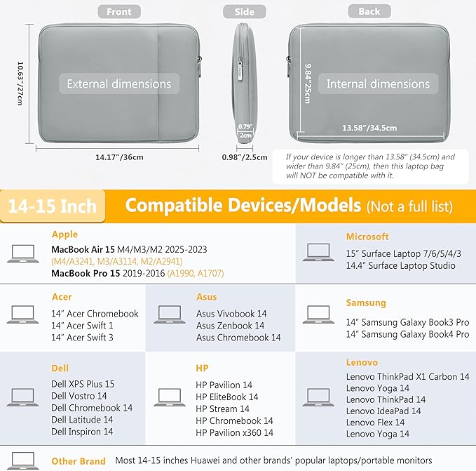 - Internal Dimensions: 13.58" x 9.84" x 0.79". Compatible with MacBook Air 15 M4/M3/M2 2025-2023(A3241, A3114, A2941), MacBook Pro 15 2019-2016(A1990, A1707), 14.4" Surface Laptop Studio, 15" Surface Laptop, HP Pavilion/EliteBook/Stream/Chromebook/Pavilion X360 14, Dell XPS 14/15 Plus, Dell Vostro/Chromebook/Latitude/Inspiron 14, Asus Vivobook/Zenbook/Chromebook 14, 14" Acer Chromebook/Swift 1/3, ThinkPad/IdeaPad/Flex/Yoga 14, ThinkPad X1 Carbon/Yoga 14, 14" Samsung Galaxy Book3/Book4 Pro, etc.