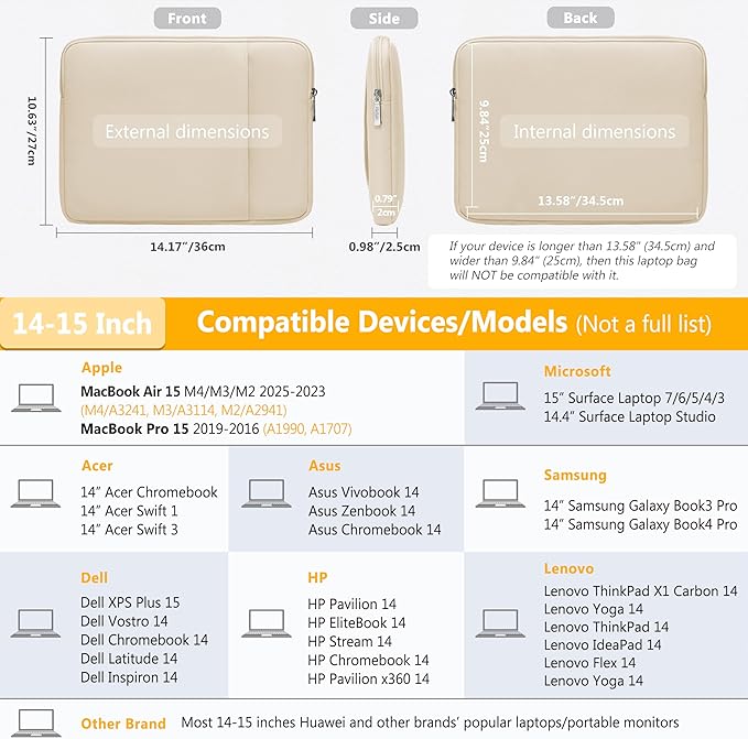 - Internal Dimensions: 13.58" x 9.84" x 0.79". Compatible with MacBook Air 15 M4/M3/M2 2025-2023(A3241, A3114, A2941), MacBook Pro 15 2019-2016(A1990, A1707), 14.4" Surface Laptop Studio, 15" Surface Laptop, HP Pavilion/EliteBook/Stream/Chromebook/Pavilion X360 14, Dell XPS 14/15 Plus, Dell Vostro/Chromebook/Latitude/Inspiron 14, Asus Vivobook/Zenbook/Chromebook 14, 14" Acer Chromebook/Swift 1/3, ThinkPad/IdeaPad/Flex/Yoga 14, ThinkPad X1 Carbon/Yoga 14, 14" Samsung Galaxy Book3/Book4 Pro, etc.