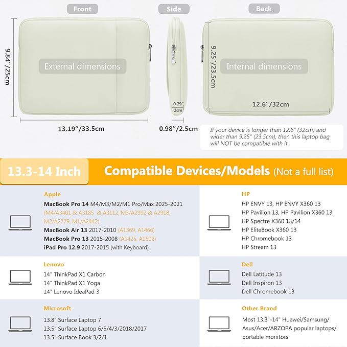 - Internal Dimensions: 12.6" x 9.25" x 0.79". Compatible with MacBook Pro 14 M4/M3/M2/M1 Pro/Max 2025-2021 (Model: A3401, A3185, A3112, A2992, A2918, A2779, A2442), MacBook Air 13 2017-2010, MacBook Pro 13 2015-2012, HP Envy/Stream/Pavilion/Chromebook 13, HP EliteBook X360 13, HP Spectre X360 13/14, iPad Pro 12.9 2017-2015, ASUS Zenbook/Vivobook/Chromebook 13, 13.8"-13.5" Surface Laptop/Book, Dell Latitude/Inspiron/Chromebook 13, 13.3" ThinkPad X390, and most 13"-13.3" slim laptops, etc.