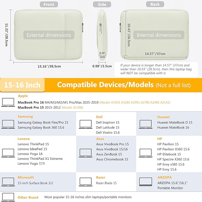 - Internal Dimensions: 14.57" x 10.43" x 0.79". Compatible with MacBook Pro 16 M4/M3/M2/M1 Pro/Max 2025-2019 (A3186 A3403 A2991 A2780 A2485 A2141), MacBook Pro 15 2015-2012 (A1398), HP Pavilion/Elitebook/Envy 15, HP Pavilion/Spectre/Envy X360 15.6, 15" Surface Book, Dell XPS 16, Dell Inspiron/Latitude/Precision/Vostro 15, Samsung Galaxy Book Flex/Pro 15, Asus ZenBook/VivoBook Pro 15, Lenovo IdeaPad/ThinkPad 15, Yoga/ThinkBook 16, VivoBook 15/16, ARZOPA 15.6"/16.1" Portable Monitor, etc.