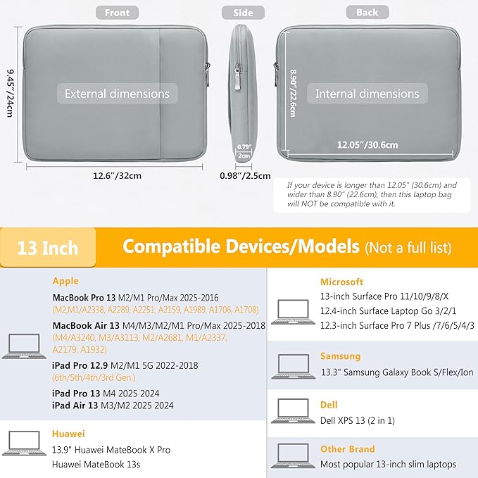 - Internal Dimensions: 12.05" x 8.9" x 0.79". Compatible with MacBook Air 13 M4/M3/M2/M1 2025-2018 (A3240, A3113, A2681, A2337, A2179, A1932), MacBook Pro 13 M2/M1 Pro/Max 2025-2016 (A2338, A2289, A2251, A2159, A1989, A1706, A1708), Dell XPS 13, 13"-12.3" Surface Pro, 12.4" Surface Laptop Go, iPad Pro 13 M4, iPad Air 13 M3/M2, iPad Pro 12.9 2022-2018, Huawei MateBook 13s, 13.9" Huawei MateBook X Pro, 13.3" Samsung Galaxy Book S/Flex/Ion, and most 12"-13" slim laptops/tablets, etc.