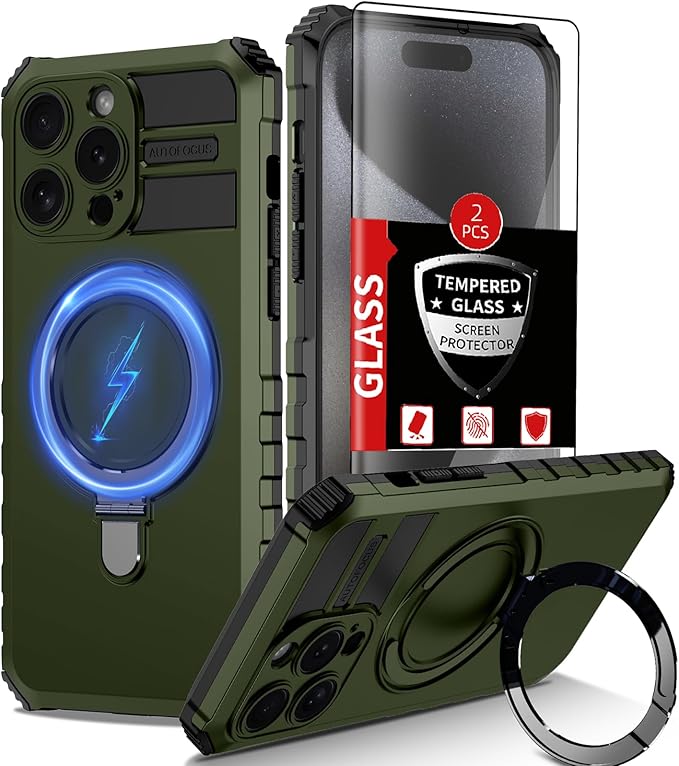 for iPhone 15 Pro Max Case Magnetic Compatible with MagSafe Wireless Charging,with 2 Screen Protectors,with Kickstand Shockproof Shock-Absorbent Heavy Duty Protection Scratch Resistant Green