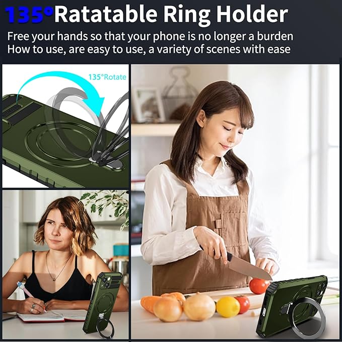 - 3.Built-in Invisible Kickstand Ring: The for iPhone 15 Case built-in aluminum magnetic ring can stand stably in portrait or landscape mode when opened, and the back is completely invisible when folded (not invisible when using Magnetic accessories). Perfect for use at your desk or anywhere you work or consume media!
