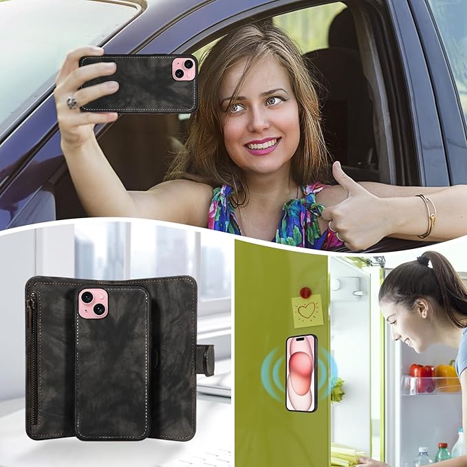 Asuwish Phone Case for iPhone 15 6.1 inch Zipper Wallet Magnetic Cell Cover with Tempered Glass Screen Protector Crossbody Strap Flip Credit Card Holder iPhone15 5G i i-Phone i15 15Case Women Black