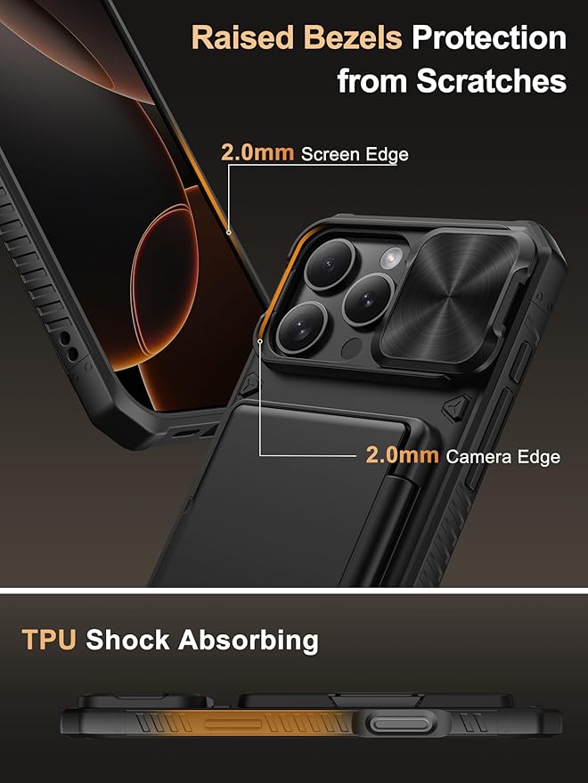 Vihibii for iPhone 16 Pro Max Case with Card Holder (4 Cards) [RFID Blocking] & Slide Camera Cover, Military Grade Drop Protection, Rugged Hard Back & Silicone Edge Wallet Phone Case 6.9" 2024, Black