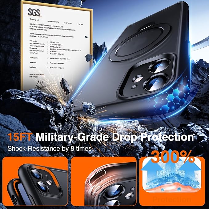 - 🧲[Stronger 38-N52 Magnetic, Compatible with MagSafe]: Our kickstand iPhone 11 Phone case with stand ring holder packs 38 N52 magnets of 80% stronger magnetic strength than others. Effortlessly attach to wireless chargers, wallets, and more–all with a satisfying snap. Moreover,it's mountain-road-proof. Imagine your iPhone sticking to your car mount like a rock climber's grip, even on the bumpiest rides. No shakes, no drops, just a solid connection that lets you focus on the drive.