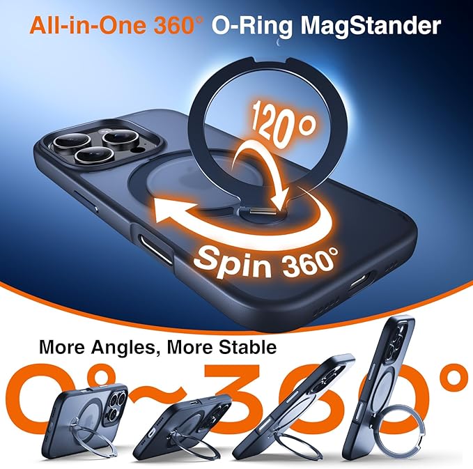 - 🏆[The Most Advanced, All-in-One 360° O-Ring MagStander]: Crafted from aerospace-grade aluminum, a testament to strength, lightness & durability. This Magnetic kickstand iPhone 16 Pro Max Ring Case Cover offers 360° all adjustable angles. With our unique 8-Gear mechanical self-locking tech, you can easily find your perfect viewing position with rock-solid stability, whether video chatting in portrait or watching movies in landscape.