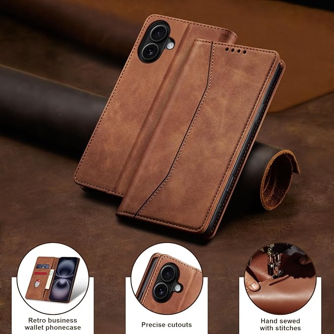 Jasonyu Flip Wallet Case for iPhone 16 Plus,Leather Magnetic Folio Cover with Card Holder,Kickstand - TPU Shockproof Durable Protective Phone Case,Brown