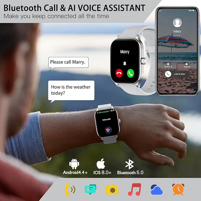 - Bluetooth Call and Smart Notifications: The smart watch with a built-in speaker and microphone, you can make and receive calls directly on the smartwatch, freeing you from your phone. And raise your wrist to light up the screen to receive notifications for calls, messages, and social media alerts directly on your wrist, so you never miss an important update while staying focused on your fitness goals.