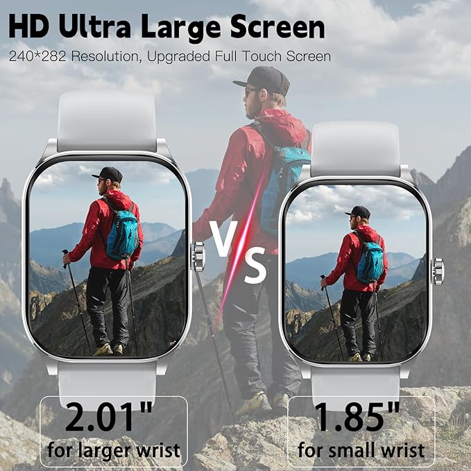 - 1.85"/2.01" HD Touch Screen and Customized Dial: The smart watch for men with a stylish design has two different screen sizes, 1.85 inches and 2.01 inches, with a comfortable adjustable watchband, suitable for men and women with different wrist sizes. The fitness watch app offers over 100 personalized dial wallpapers to choose from, you also can customize your dial wallpaper. And this smartwatches for men and women complements any outfit, whether you're at the gym or out for a casual stroll.